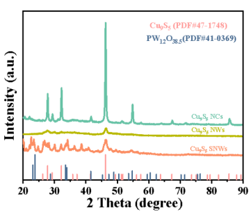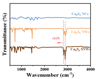 Şekil 3'te gösterildiği gibi Cu9S5 SNW'lerin FT-IR spektrumunda, Cu9S5 NW'lere kıyasla Cu ve S arasındaki elektronik etkileşimi gösteren önemli bir kırmızıya kayma fenomeni gözlendi. Cu9S5 NW'lerin ve Cu9S5 SNW'lerin 2916 cm-1 ve 2846 cm-1'deki karakteristik zirveleri, dodekanetiyoldeki metilenin (-CH2-) gerilme titreşim moduna atfedilebilir. 1471 cm-1'deki karakteristik zirve, C-H bağının bükülme titreşim moduna karşılık gelir.