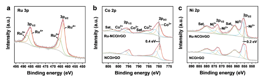 XPS teknolojisi, katalizör yüzeylerinin elementel bileşimini, kimyasal durumlarını ve elektronik yapısını derinlemesine analiz edebilir. Katalizör yüzeyi X ışınlarına maruz kaldığında yüzey atomlarının elektronları uyarılır. Bu fotoelektronların enerjisini ve miktarını tespit ederek elementin türü ve içeriğinin yanı sıra elementin bulunduğu kimyasal ortamı da belirleyebiliriz. Örneğin, desteklenen metal katalizörleri incelerken XPS, desteğin yüzeyindeki metalin formunu (metal element mi yoksa metal oksit mi olduğunu) ve oksidasyon durumundaki değişiklikleri doğru bir şekilde belirleyebilir. Bu, katalizörün aktivitesini ve deaktivasyon mekanizmasını anlamak için çok önemlidir. Şekil 5'te gösterildiği gibi XPS, Ru, Co ve Ni elementlerinin bileşimini ve değerlik durumlarını göstermek için kullanıldı. Numunedeki belirli elementlerin XPS ince spektrumları, elektronik etkileşimlerin varlığını gösteren bağlanma enerjisinin pozitif/negatif kaymasını belirlemek için kullanıldı.