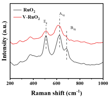 Şekil 4'te gösterildiği gibi, V-RuO2'nin (V-katkılı RuO2) Raman spektrumu, V2O5 üretimi hariç başka hiçbir benzersiz tepe noktası olmaksızın RuO2'ninkiyle tutarlıdır. V katkılaması, RuO2'nin A1g modunu daha düşük dalga numaralarına kaydırır; bu, V'nin eklenmesinin kafes yapısını ve kimyasal bağlanma ortamını (oksijen boşlukları veya yerel kusurlarla sonuçlanabilecek) önemli ölçüde etkilediğini, dolayısıyla elektronik yapısını değiştirdiğini gösterir; A1g zirvesinin sola kayması, V atomları ile RuO2 kafesi arasındaki etkileşimi yansıtır; bu, V katkılamanın, RuO2'nin yerel simetrisini ve bağ uzunluğu özelliklerini modüle ettiğini gösterir.